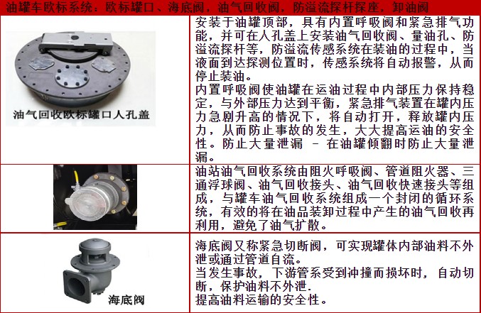 ![]() ![]() 油罐車(chē)歐標(biāo)系統(tǒng):歐標(biāo)罐口、海底閥,油氣回收閥,防溢流探桿探座,卸油閥。